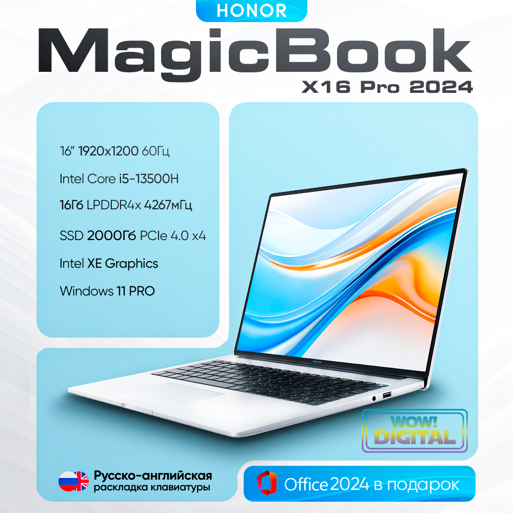 16" Ноутбук HONOR MagicBook 16X PRO 2024 Intel Core i5-13500H, RAM 16 ГБ, SSD 512 ГБ, Intel Xe Graphics, Win11Pro + MS Office 2024, серебристый, Русско-английская раскладка