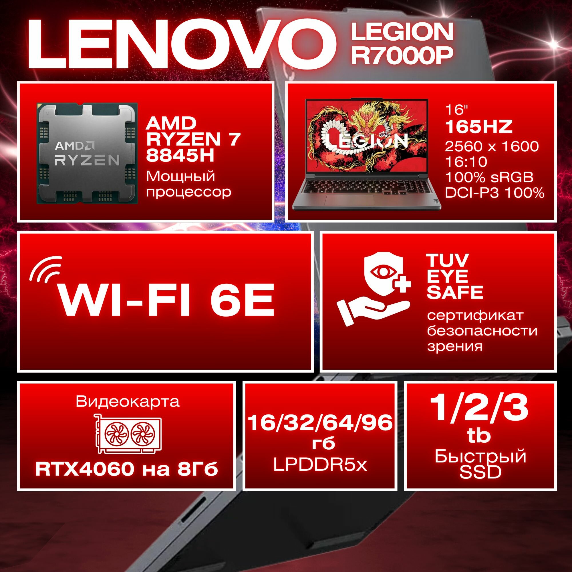 16" Игровой ноутбук Lenovo Legion Slim 5 (R7000P) 16AHP9 2024, Ryzen 7 8845H, IPS 2.5K 165Гц, RTX 4060, RAM 16ГБ, SSD 1ТБ, 83DH0000CD, Windows 11 Home, Русская раскладка, Серый