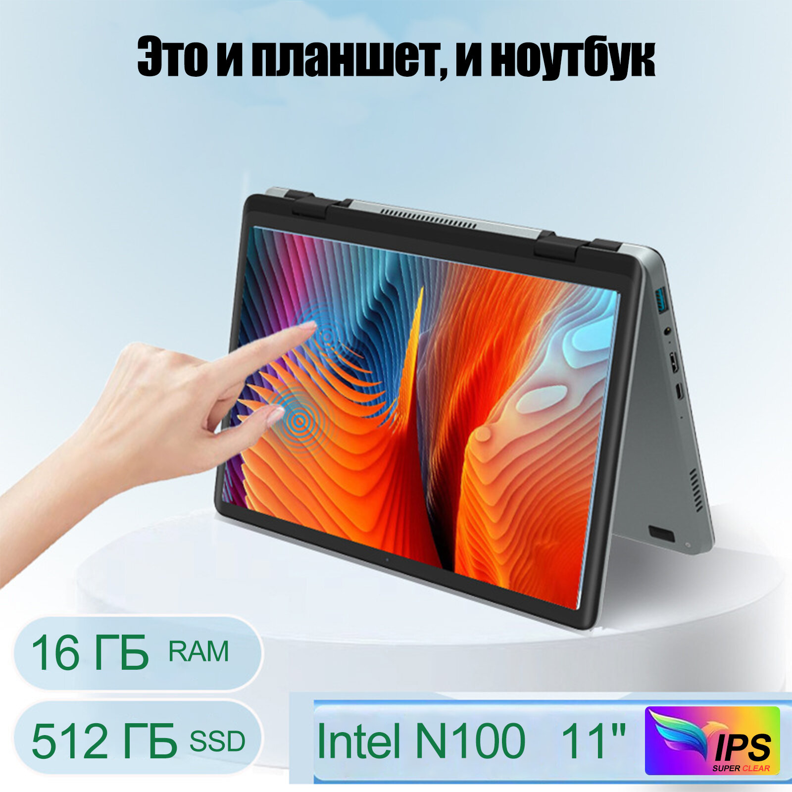 Сенсорный экран Ноутбук 11" Intel Celeron N100, RAM 16GB, SSD 512GB, Складывание на 360° интересное: