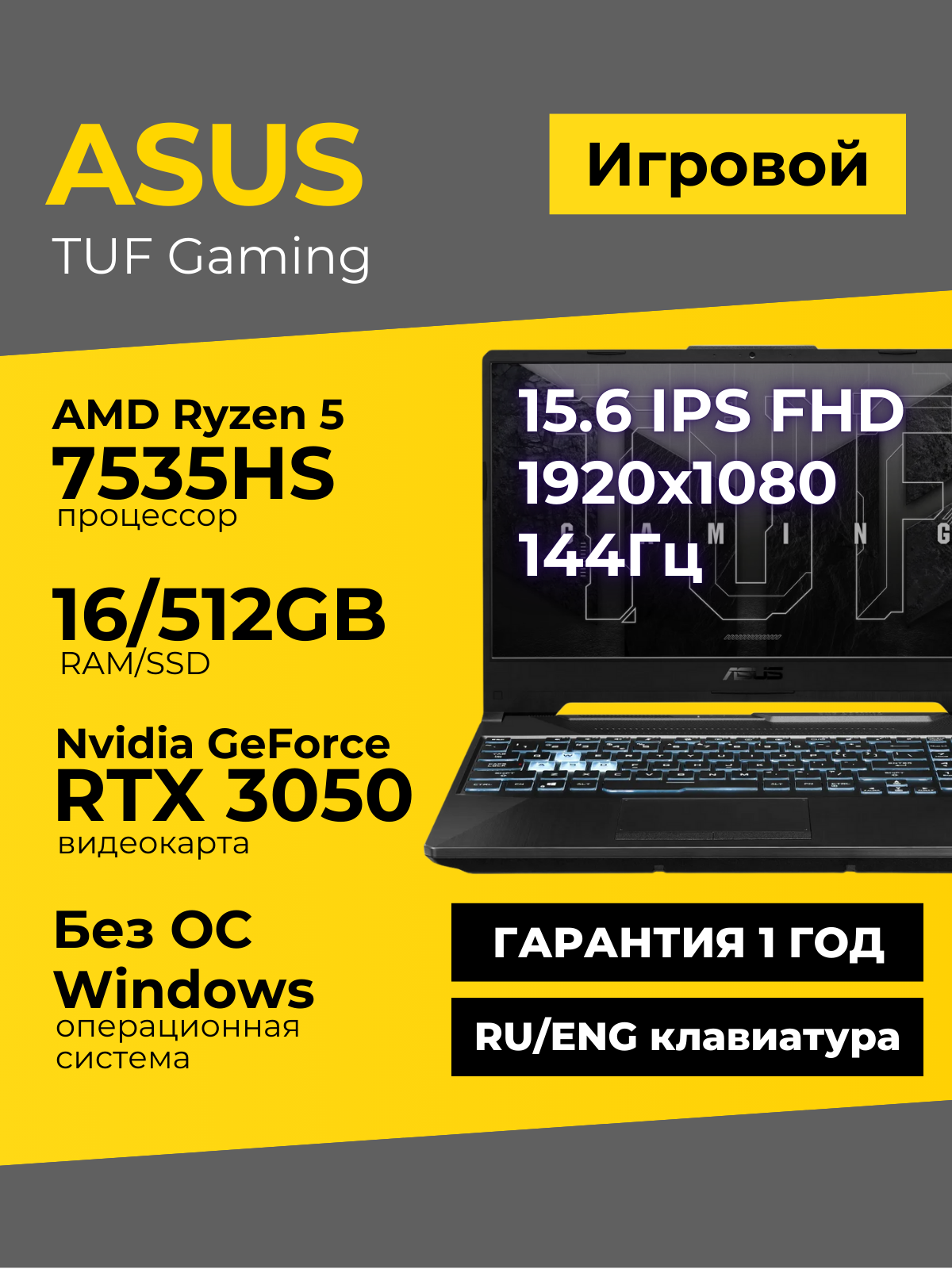 Ниже Вы можете прочитать отзывы на Игровой ноутбук Asus TUF Gaming A15 15.6 IPS 144Гц FHD Ryzen 5 7535HS 16ГБ 512ГБ GeForce RTX 3050 Чёрный Без ОС, ознакомится с подробными характеристиками, посмотреть интересные обзоры и фотографии на Игровой ноутбук Asus TUF Gaming A15 15.6 IPS 144Гц FHD Ryzen 5 7535HS 16ГБ 512ГБ GeForce RTX 3050 Чёрный Без ОС.