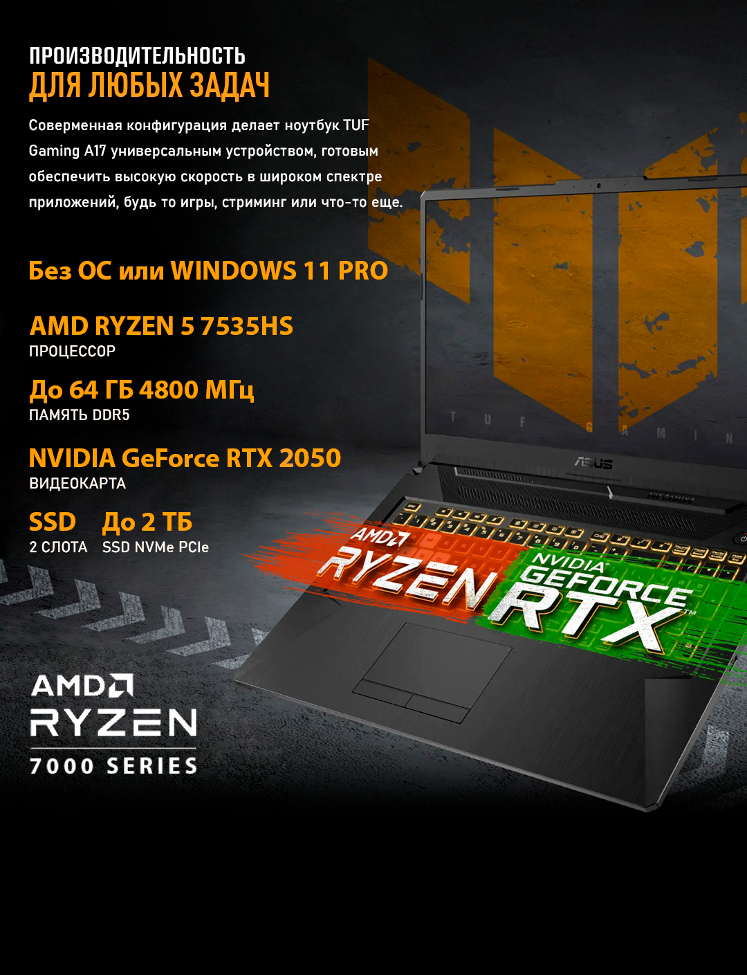 Купить Игровой ноутбук Asus TUF Gaming A17 17.3 IPS 144Гц FHD Ryzen 5 7535HS 32ГБ 1ТБ GeForce RTX2050 Чёрный Windows11+Office