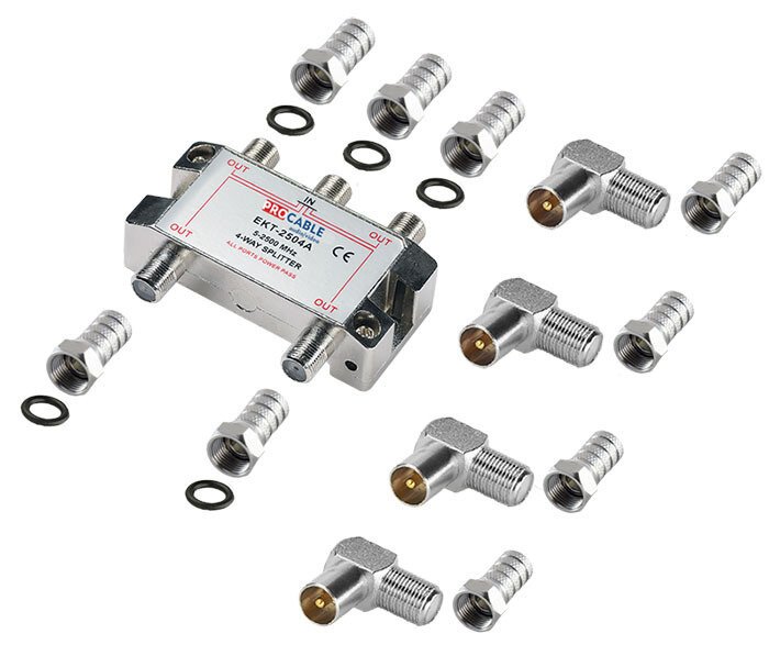 ТВ комплект №43: Делитель/сплиттер на 4 ТВ 5-1000 МГц, с разъёмом F (5 штук) и наборами - ТВ штекер угловой + F (4 штуки)