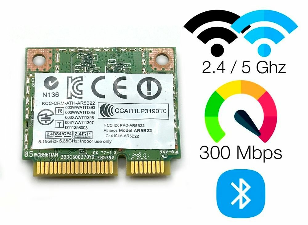 Ниже Вы можете прочитать отзывы на Двухдиапазонный WiFi адаптер Atheros AR5B22 (Mini PCI-E half-size, B/G/N, 300 Mbit/s, 2.4/5 Ghz), ознакомится с подробными характеристиками, посмотреть интересные обзоры и фотографии на Двухдиапазонный WiFi адаптер Atheros AR5B22 (Mini PCI-E half-size, B/G/N, 300 Mbit/s, 2.4/5 Ghz).
