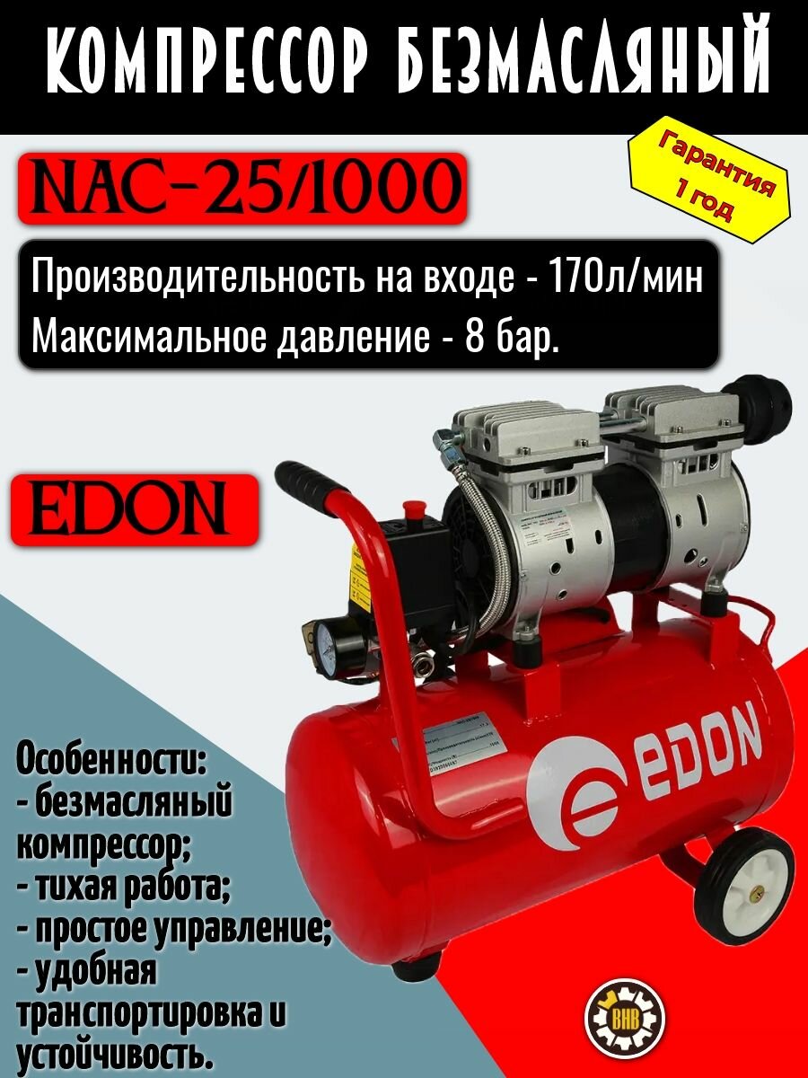 Купить Безмасляный компрессор EDON NAC-25/1000, однопоршневой, 0.7кВт, 25л