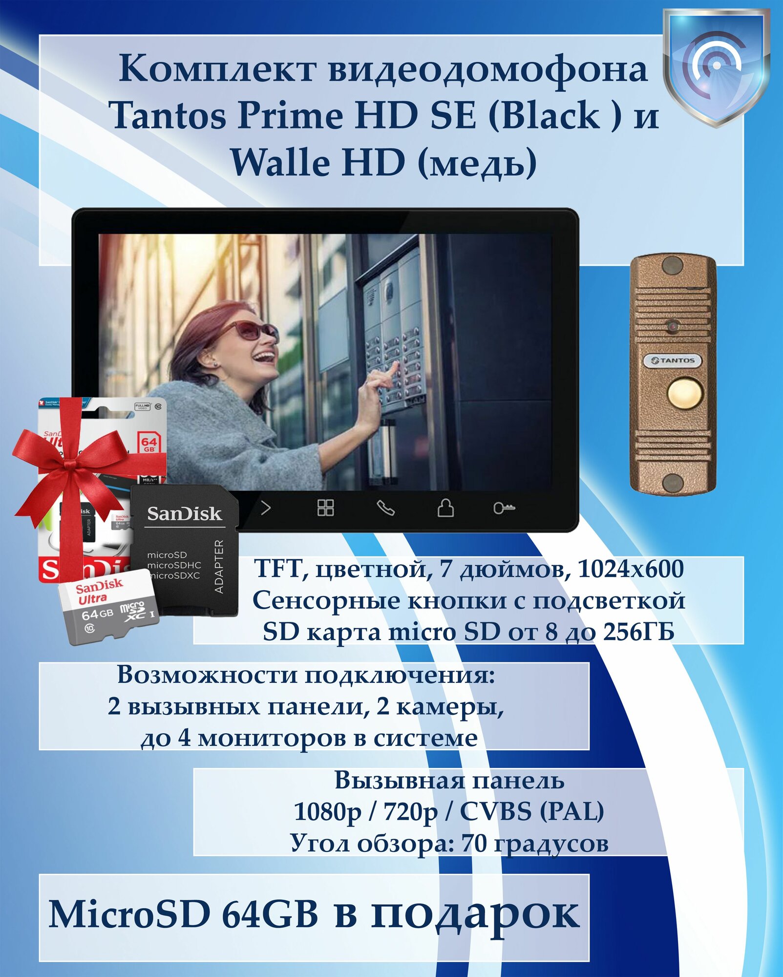 Комплект видеодомофона Tantos Prime HD SE (Black) и WALLE HD (медь) интересное: