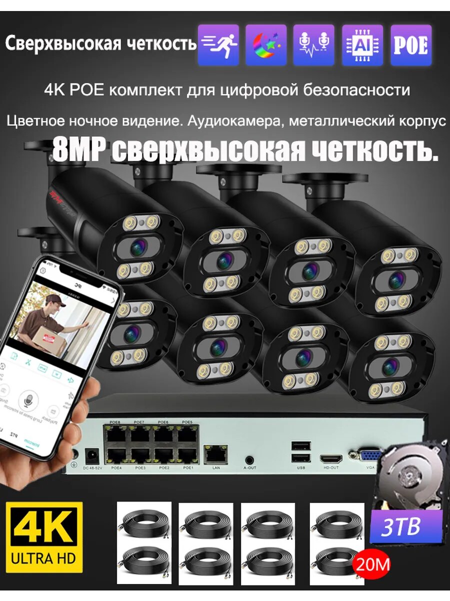 Купить 4K система безопасности 8 камер: 3 ТБ HDD, H.265, PoE, AI-детекция людей, ИК + аудио, управление с телефона