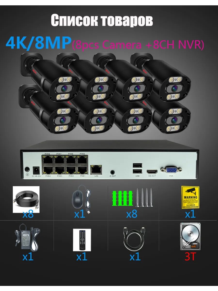 Сохранить4K система безопасности 8 камер: 3 ТБ HDD, H.265, PoE, AI-детекция людей, ИК + аудио, управление с телефона интересное: