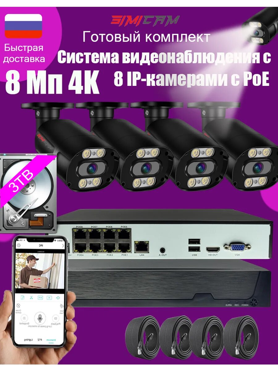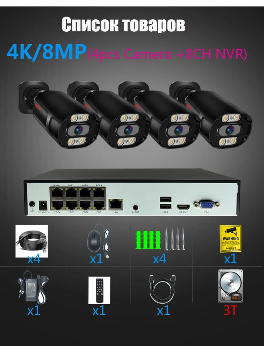 Купить 8-канальный POE NVR комплект 4K 8MP 4 камеры с двусторонним звуком, 3TB HDD, цветное ночное видение, защита IP66