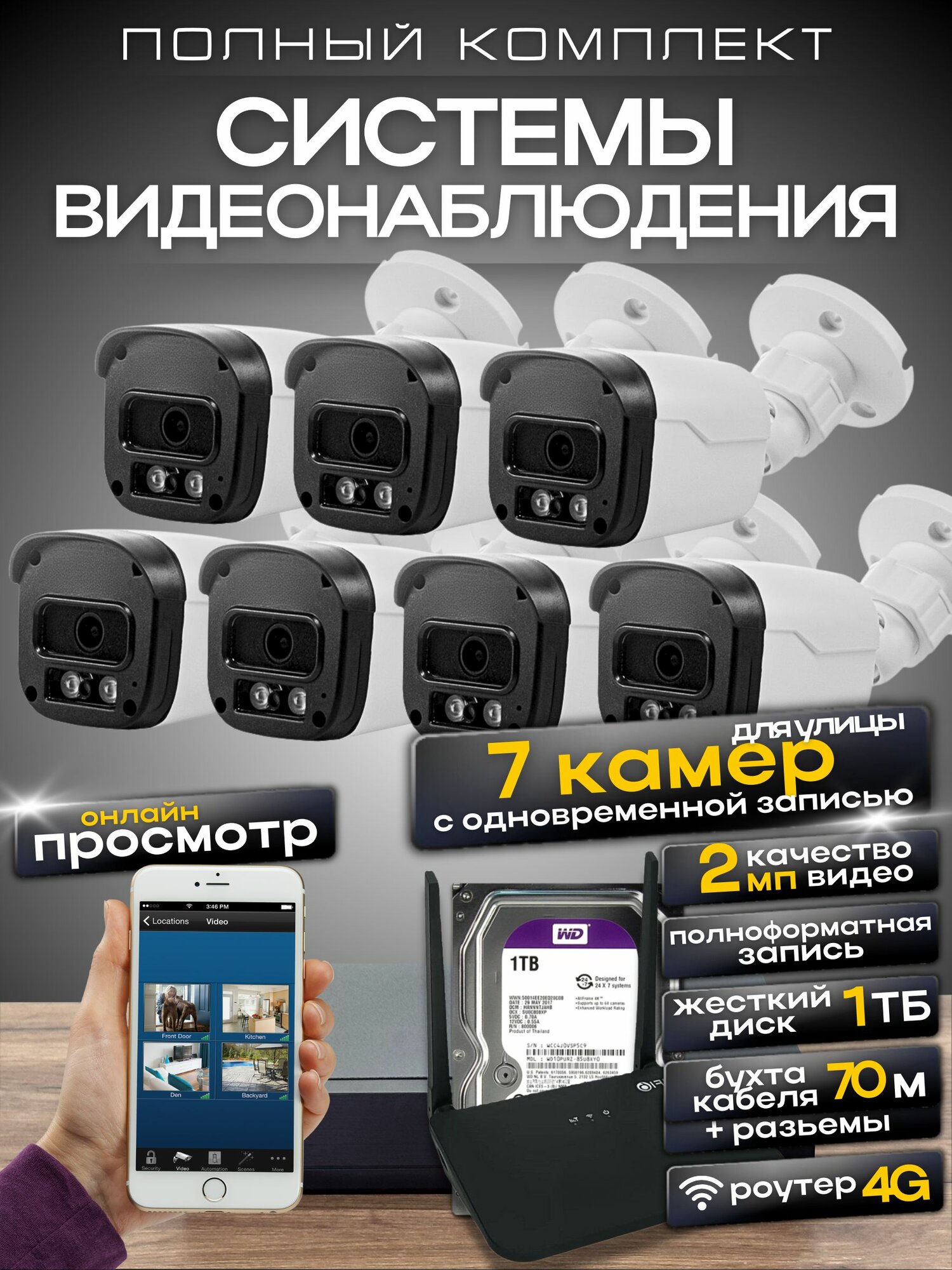 Купить Комплект видеонаблюдения с 3/4G роутером, 7 камер 2Мп, Ucam