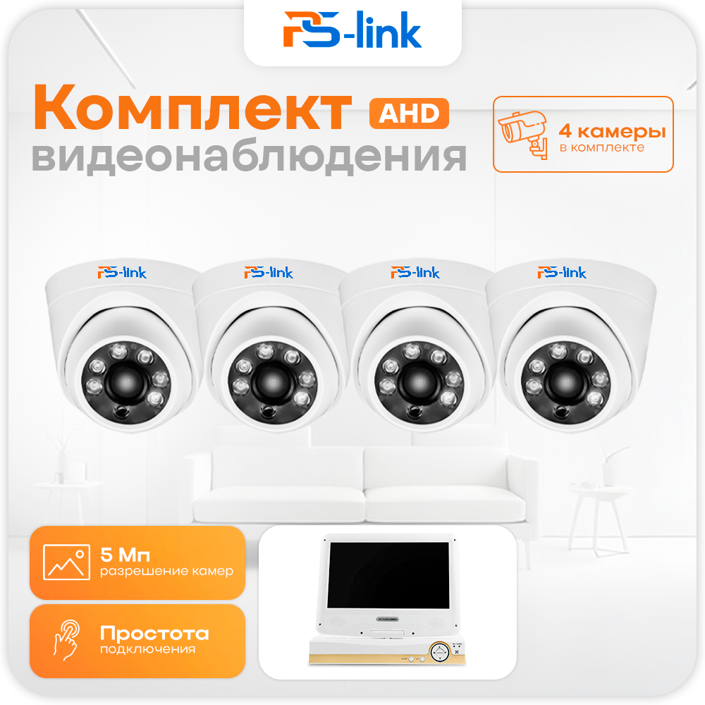 Купить Комплект видеонаблюдения с встроенным монитором PS-KIT-A9504HD 4 купольные AHD камеры 5Мп, удаленный доступ, детекция движения