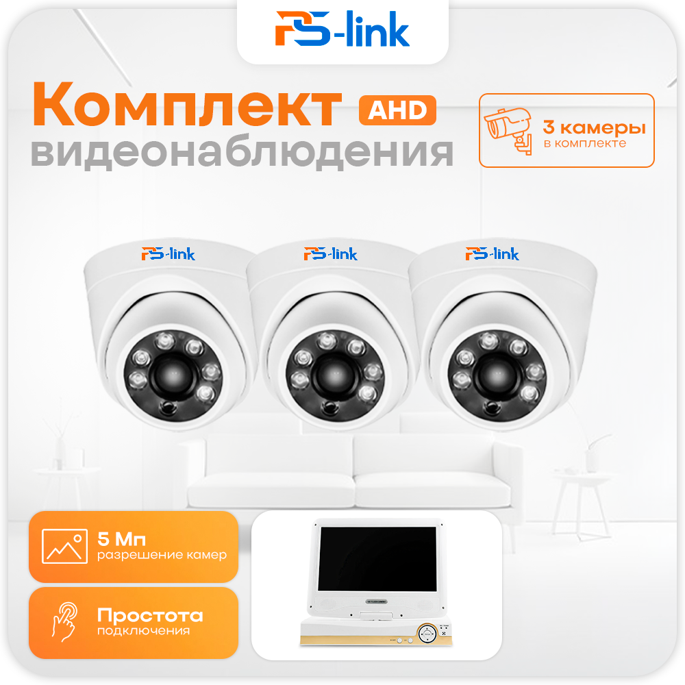 Купить Комплект видеонаблюдения с встроенным монитором PS-KIT-A9503HD 3 купольные AHD камеры 5Мп, удаленный доступ, детекция движения