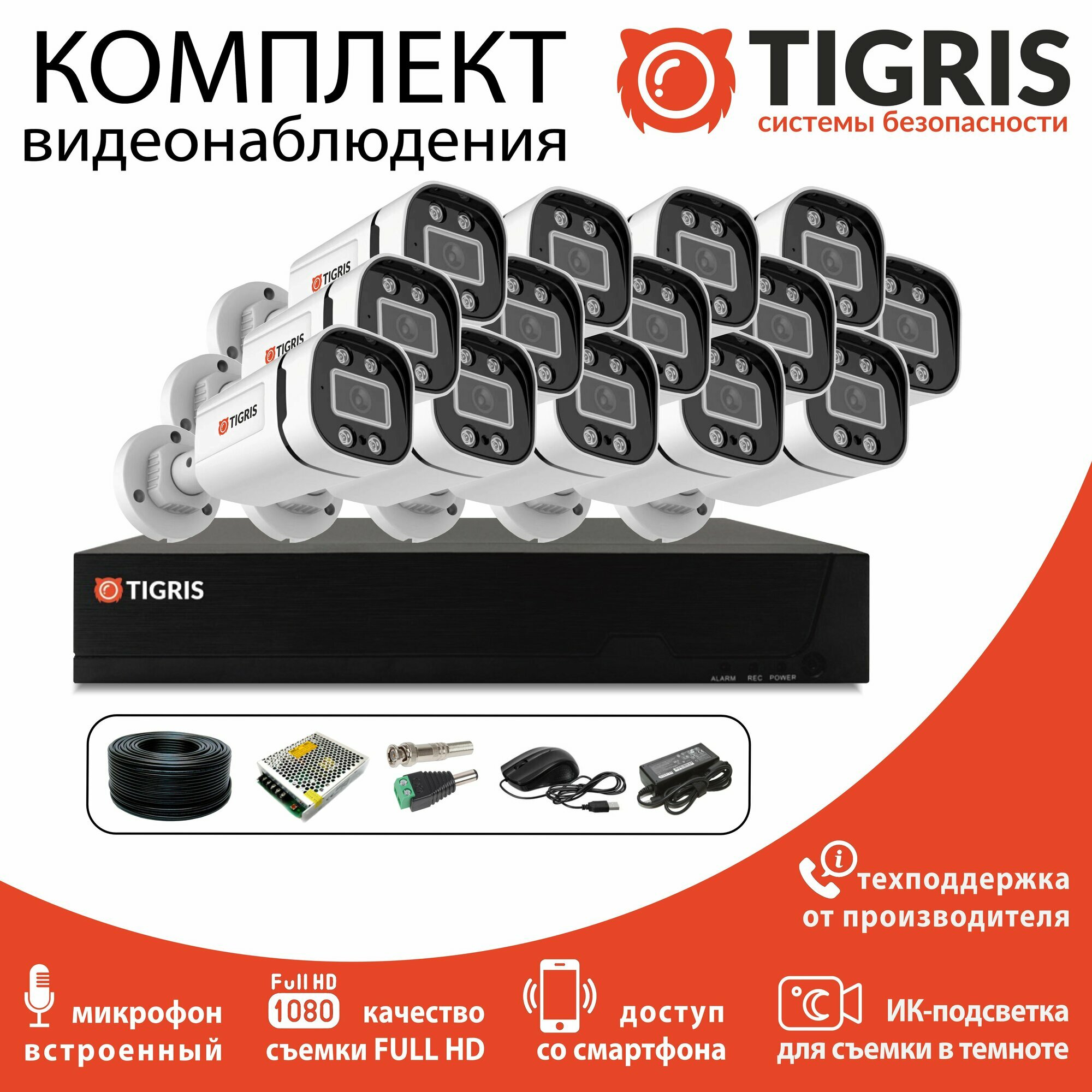 Готовый комплект видеонаблюдения FULL HD на 16 уличных камер с микрофоном