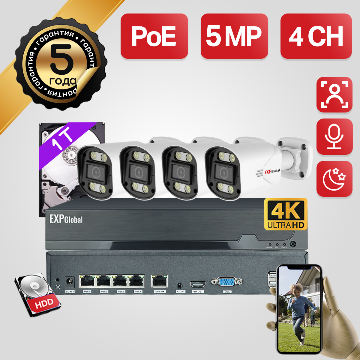 Готовый комплект IP видеонаблюдения на 4 уличные 5Мп камеры с 1 ТБ HDD, цветная ночная съемка (Кабель в комплект не входит) интересное:
