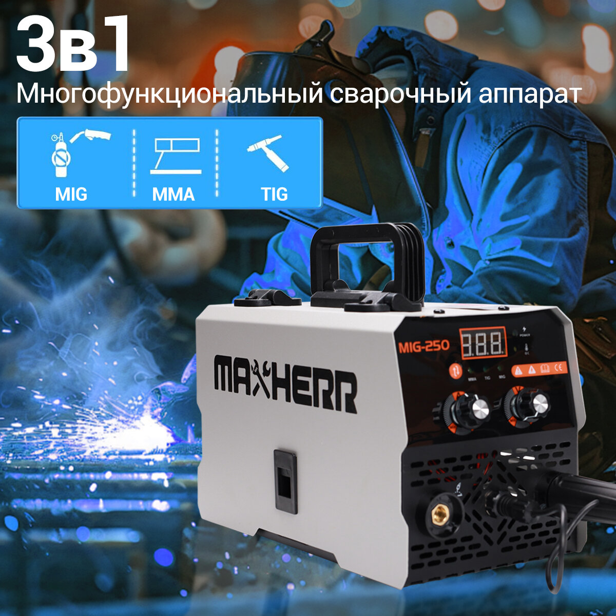 Купить Сварочный полуавтомат MAXHERR MIG-250,250A,MMA/TIG/MIG,Диаметр проволоки 0.8-1 мм