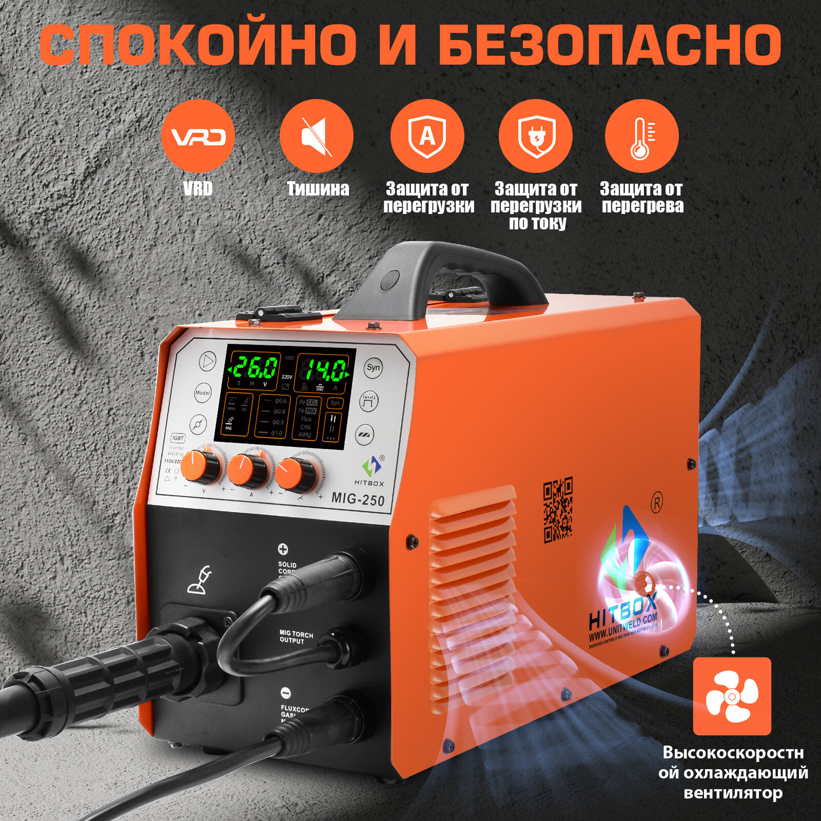 Сварочный аппарат инверторный / Сварочный полуавтомат без газа, с газом HITBOX MIG250 6 в 1 интересное: