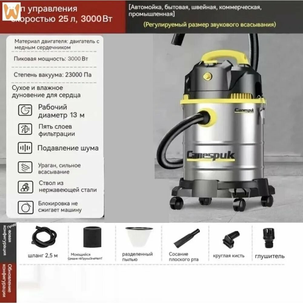 Строительный пылесос, 25л, 1800Вт, сухой и влажный тип уборки, система очистки фильтра полуавтоматическая интересное: