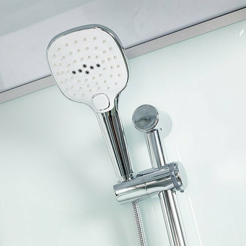 все, что нужно для комфорта, верхний душ, обычная лейка, мощная вентиляция, сидение, полка с ограничителем. Профиль прочный, стекло толстое, все надежно и безопасно. |