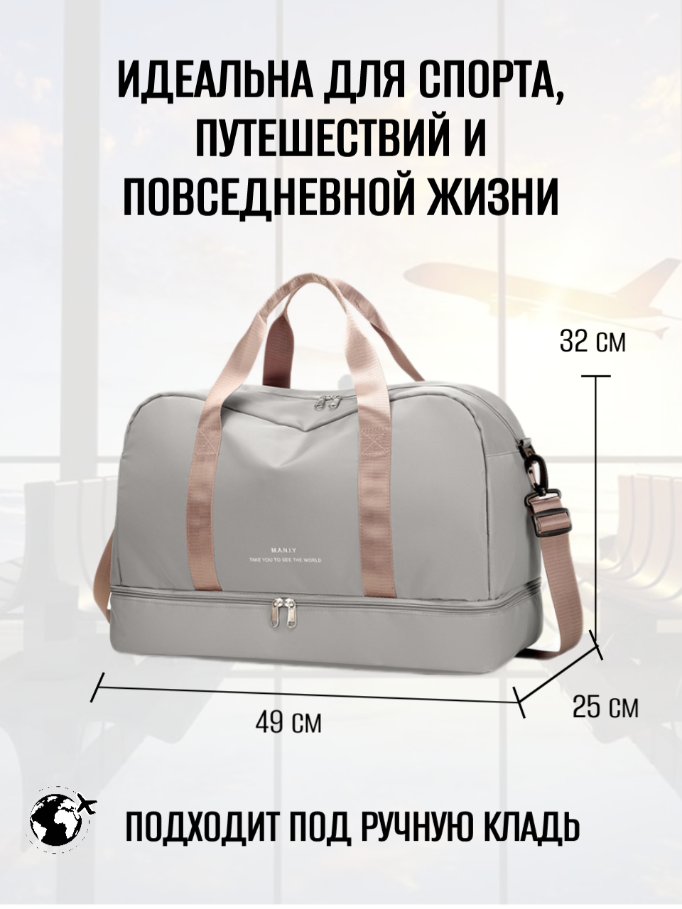 Сумка спортивная , 35 л, 25х32х49 см, ручная кладь, серый интересное: