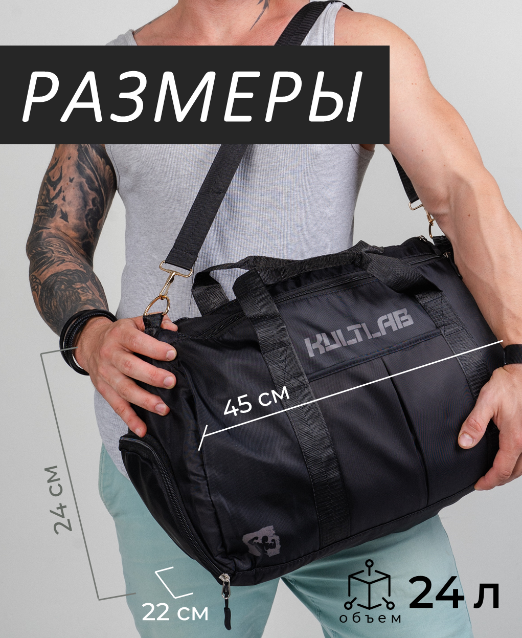 Сумка спортивная KULTLAB, 24 л, 22х24х45 см, ручная кладь, черный интересное: