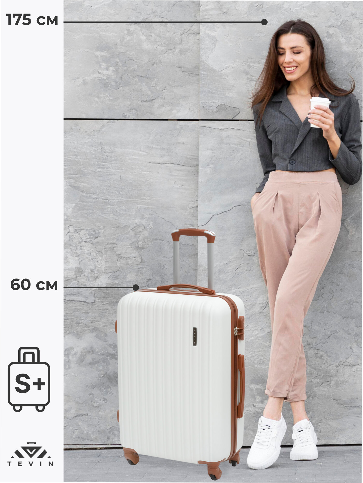 Чемодан TEVIN, 37 л, размер S, белый/коричневый