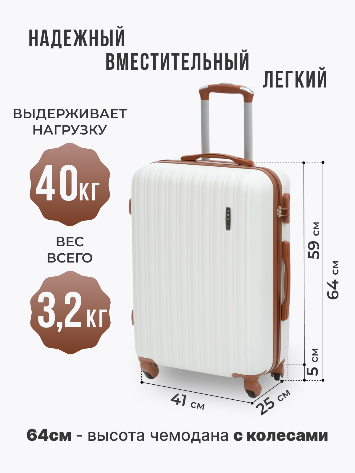 Чемодан TEVIN, 105 л, размер L, белый/коричневый