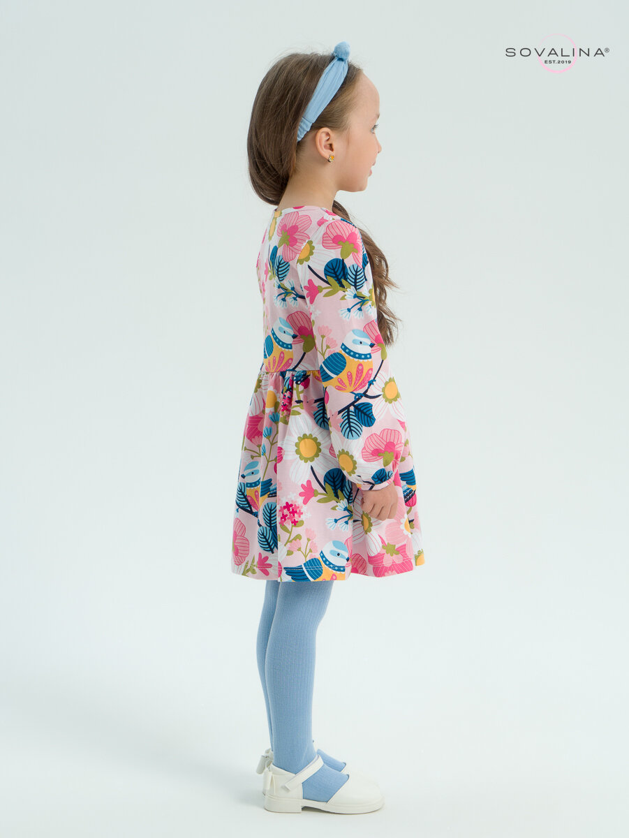 Школьное платье SOVALINA, размер 122, птички на розовом интересное: