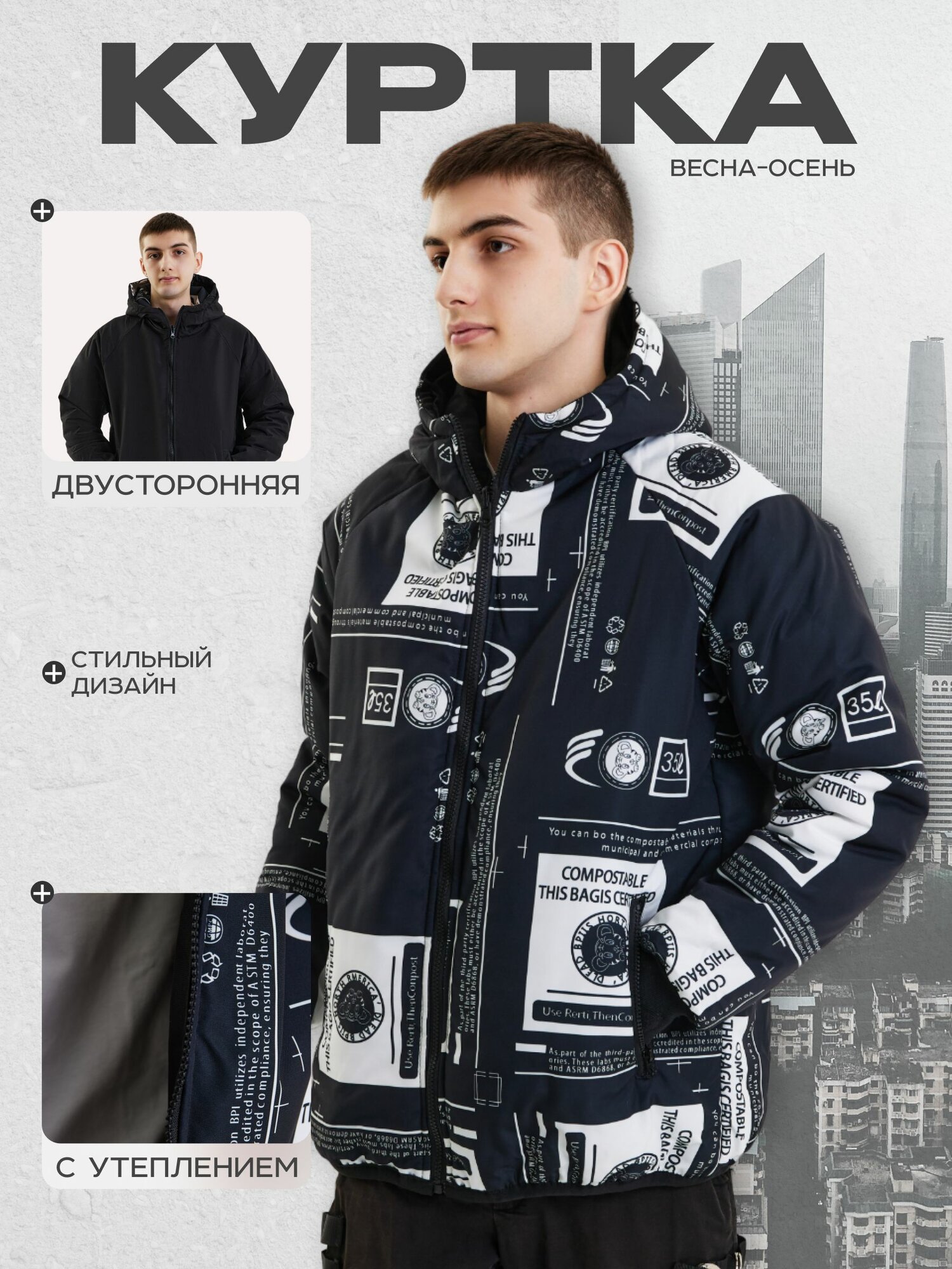 Куртка, размер L, черный, белый