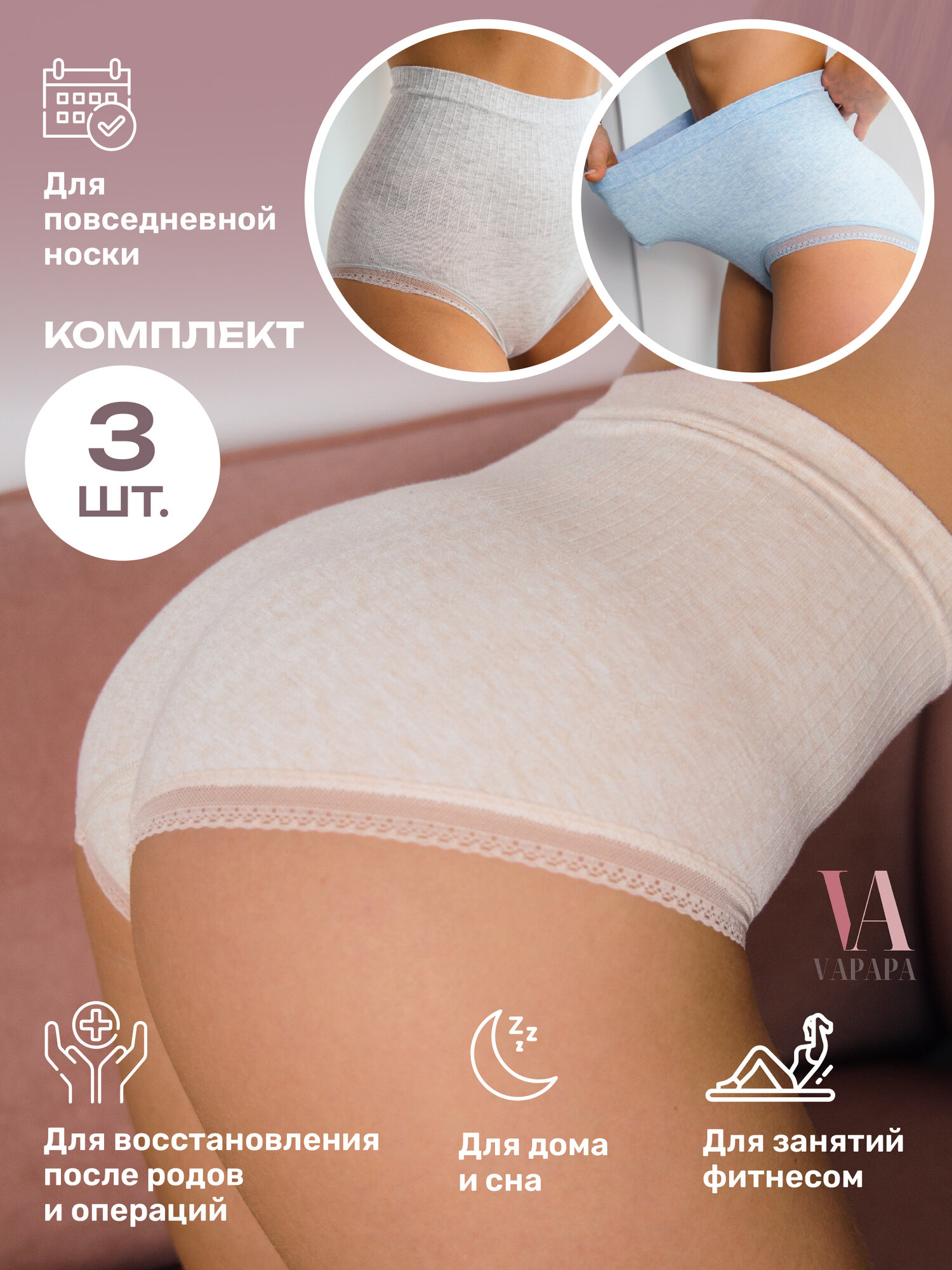 Купить Трусы VAPAPA Трусы женские высокая талия слипы, хлопок, набор, размер 42-46, голубой, серый, бежевый