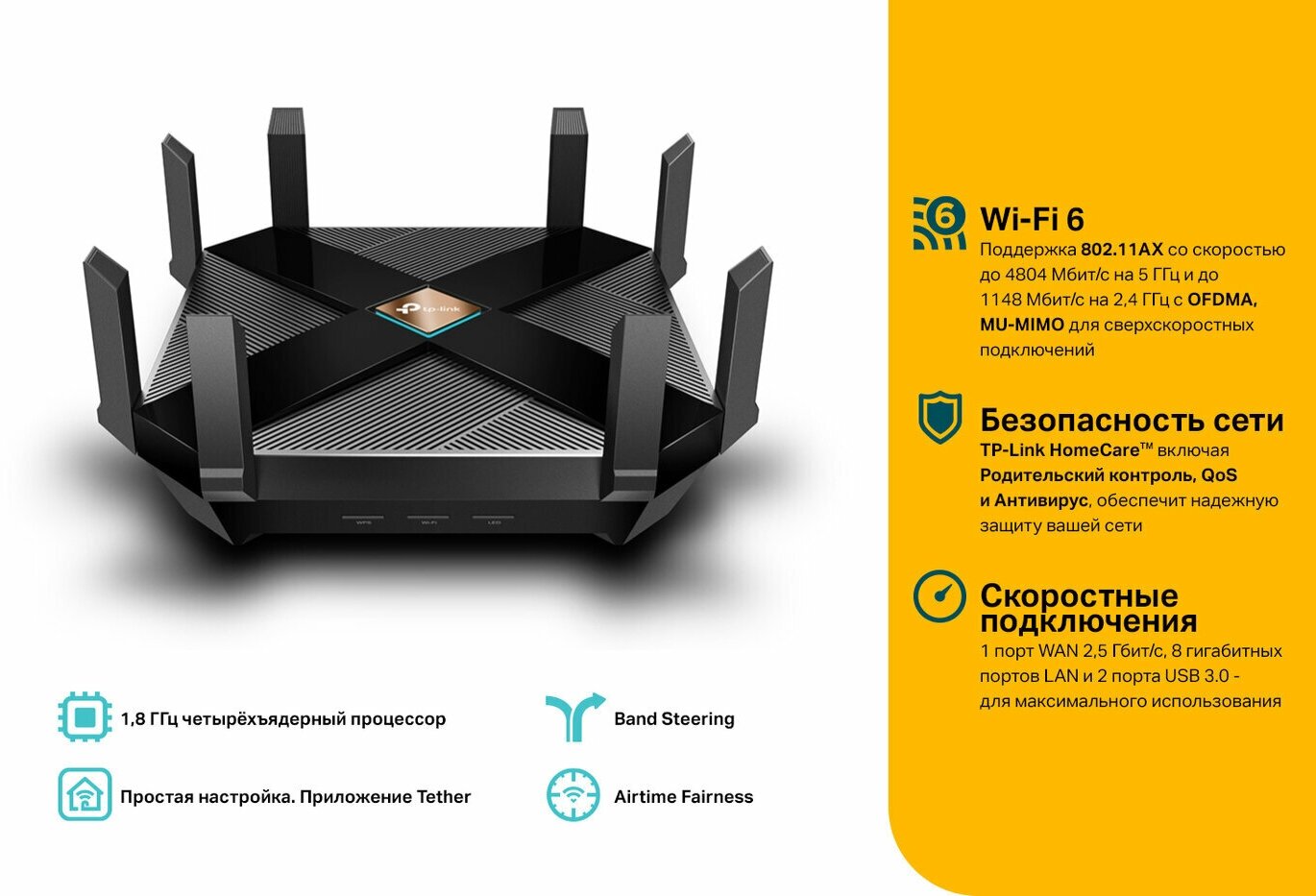 TP-Link Archer AX6000 Трехдиапазонный Wi-Fi роутер, до 1148Мбит/с на 2 ГГц и до 4804Мбит/с на 5ГГц-1 и 4804Мбит/с на 5ГГц-2
