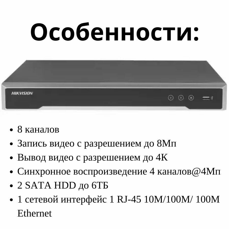 Видеорегистратор HIKVISION DS-7608NI-K2 8-ми канальный, Видеовход: 8 каналов; аудиовход: двустороннее аудио 1 канал RCA; видеовыход: 1 VGA до 1080Р, 1