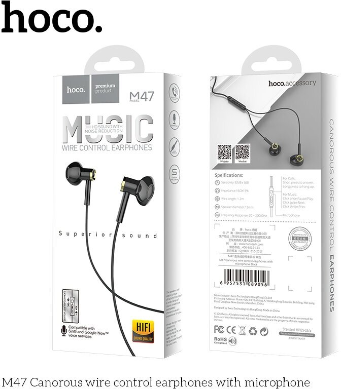 Наушники внутриканальные проводные HOCO M47 Canorous, микрофон, кабель 1.2 м, цвет чёрный