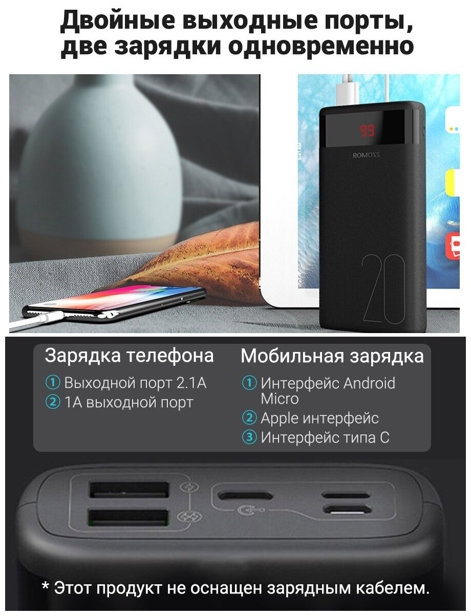 Индикатор заряда Поддержка зарядки двух устройств Наличие 3 разных разъемов для зарядки: micro-usb, usb type-c и Lightning Бренд вроде какой-то. У Romoss есть даже свой приличный сайт, специализируется на зарядных устройствах |