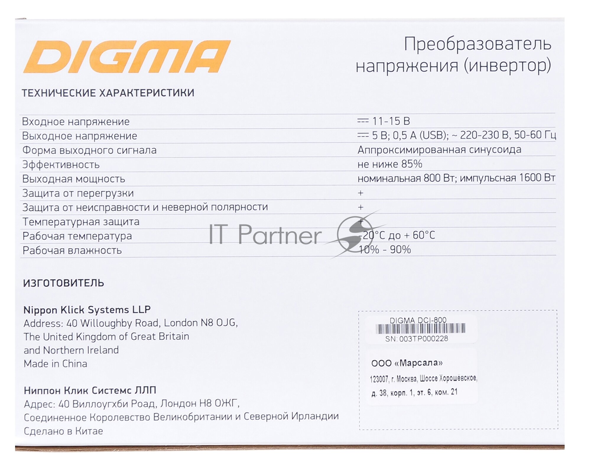 Инвертор Digma DCI-800 800Вт с 12В на 220В