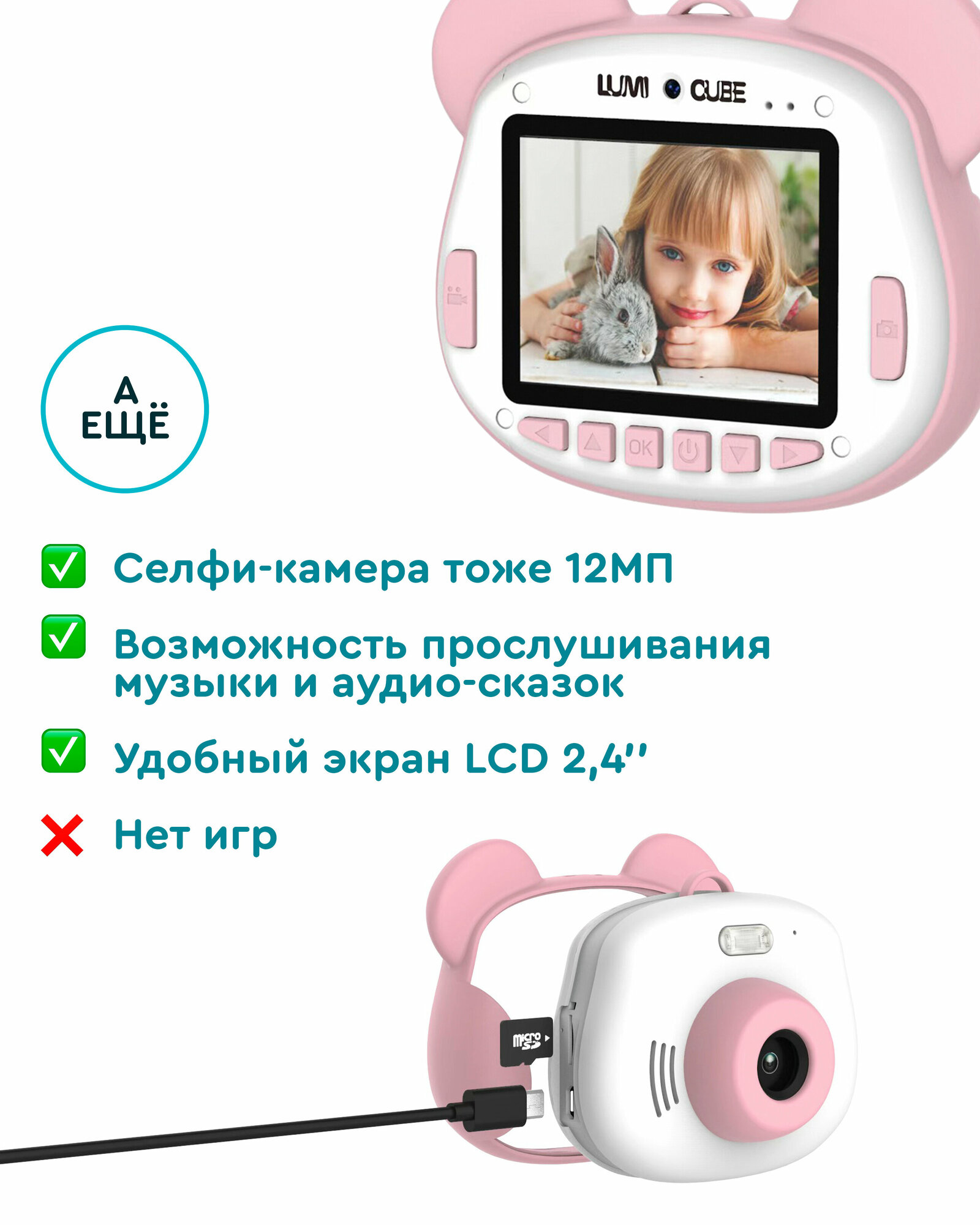 | Плюсы: | идеальный подарок для ребенка 3-7 лет, процесс увлекательный, фото, селфи, видео, сказки, музыка, озвучивание, комплименты, дизайн, шнурок, карта памяти в комплекте |