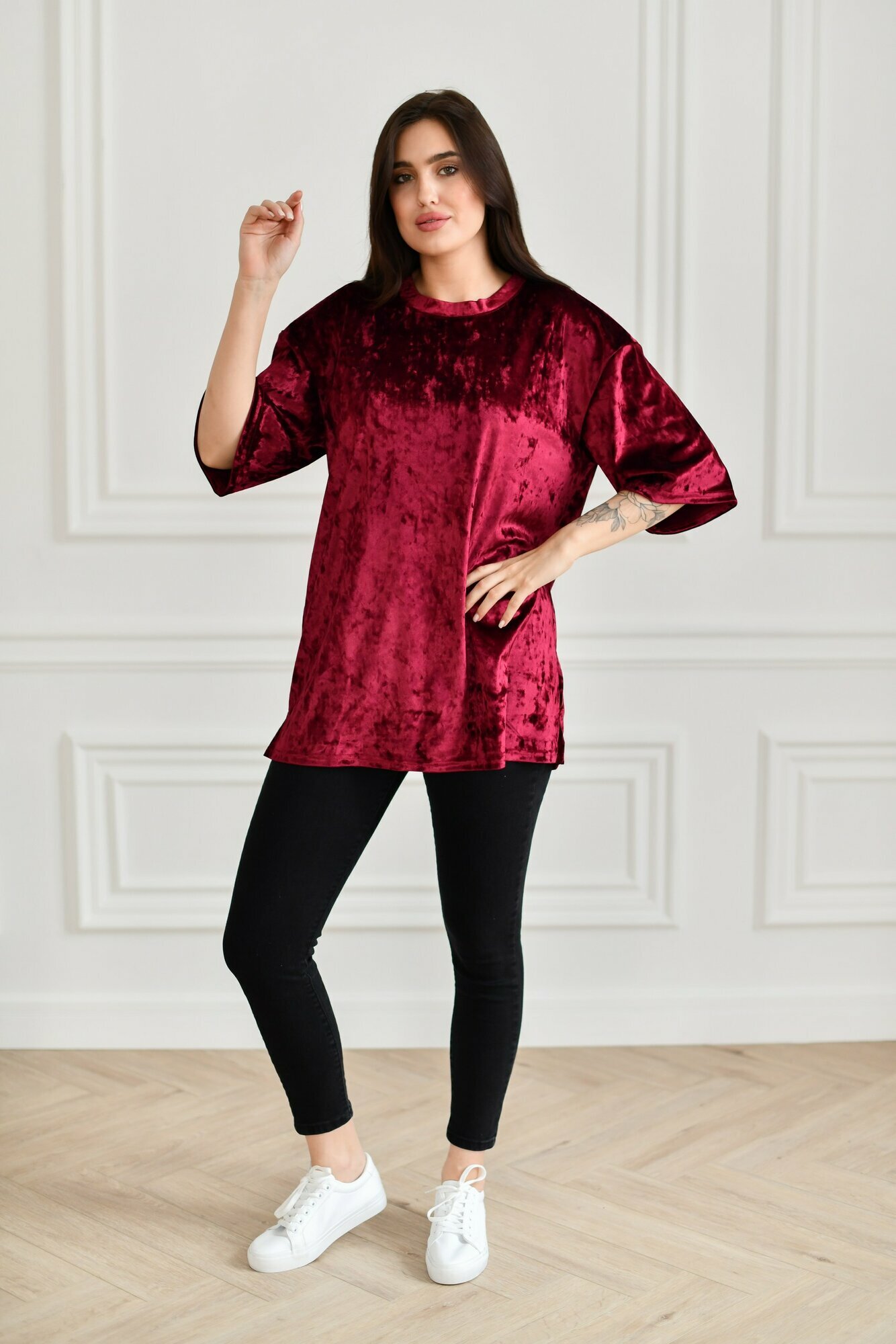 Футболка BUY-TEX.RU женская, велюровая, оверсайз, размер 46, бордо