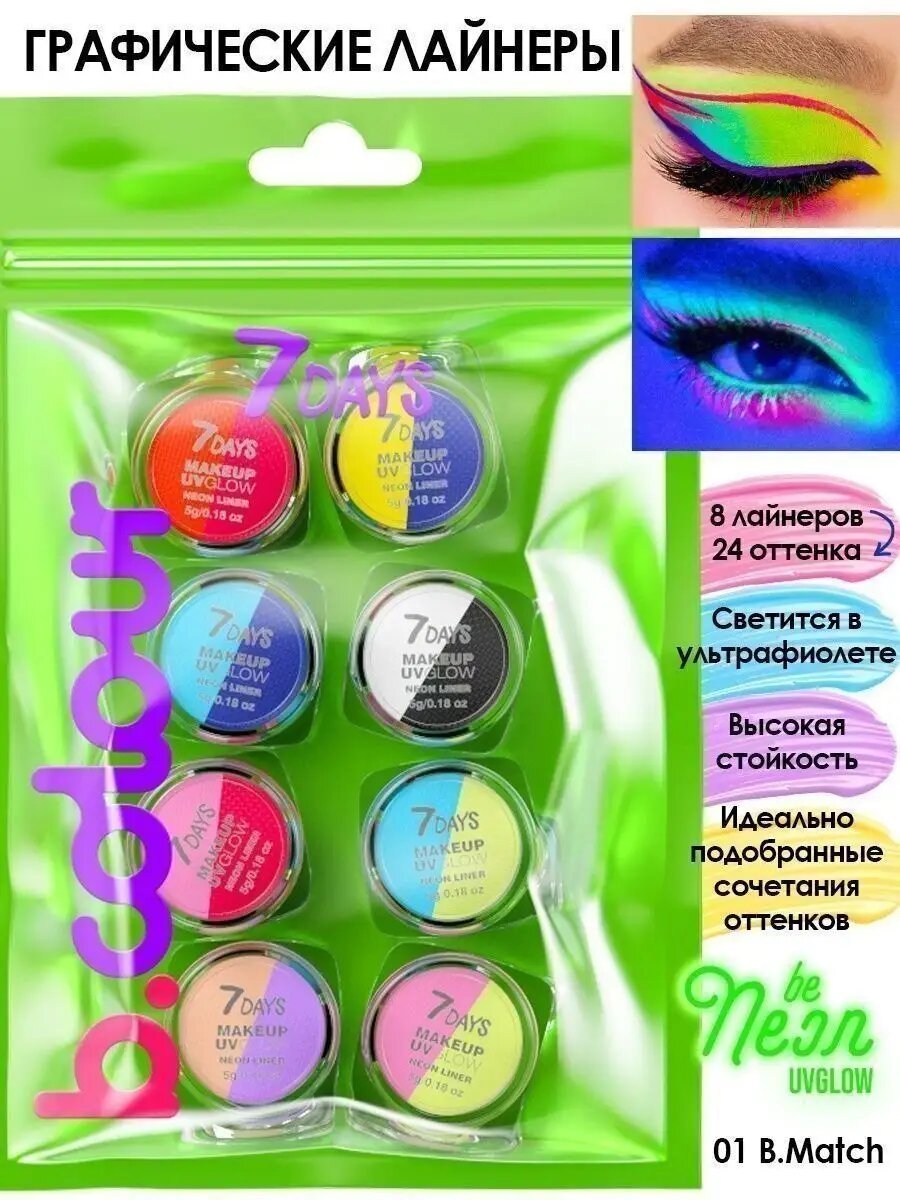 7DAYS Подводка для глаз водостойкая набор B.COLOUR, UV GLOW NEON интересное: