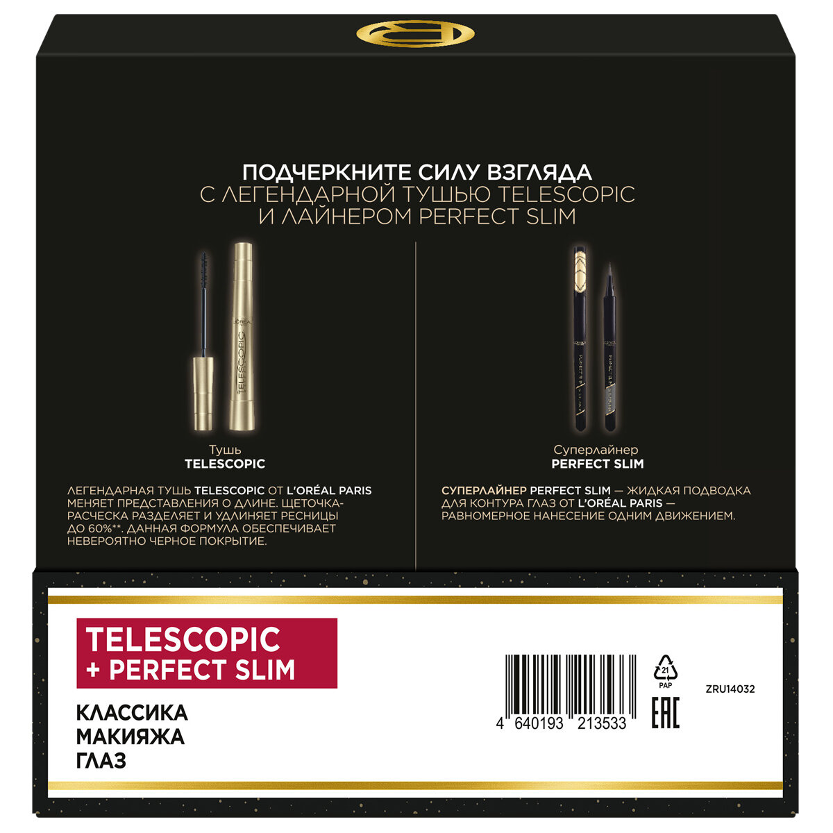 Набор декоративной косметики L'Oreal Paris (Тушь для ресниц Telescopic черная + Лайнер для глаз Perfect Slim) интересное: