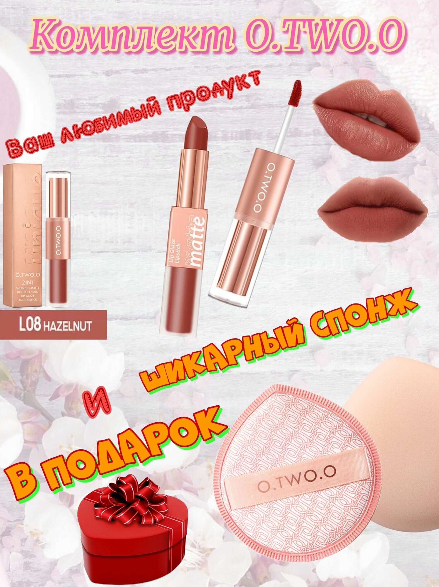 Купить Набор O.TWO.O: Матовая губная помада и Вельветовый тинт,2в1, тон 08(Лесной Орех),2.5грx4гр + спонж в подарок.