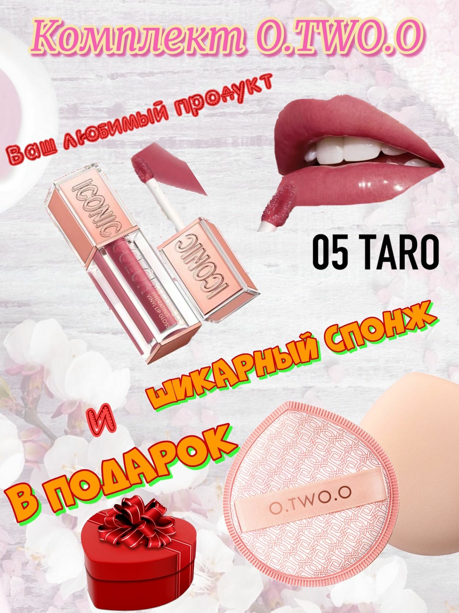Набор O.TWO.O: Увлажняющий блеск для губ "Виниловый Эффект", тон 04, (Сакура), 3.3гр + спонж в подарок.