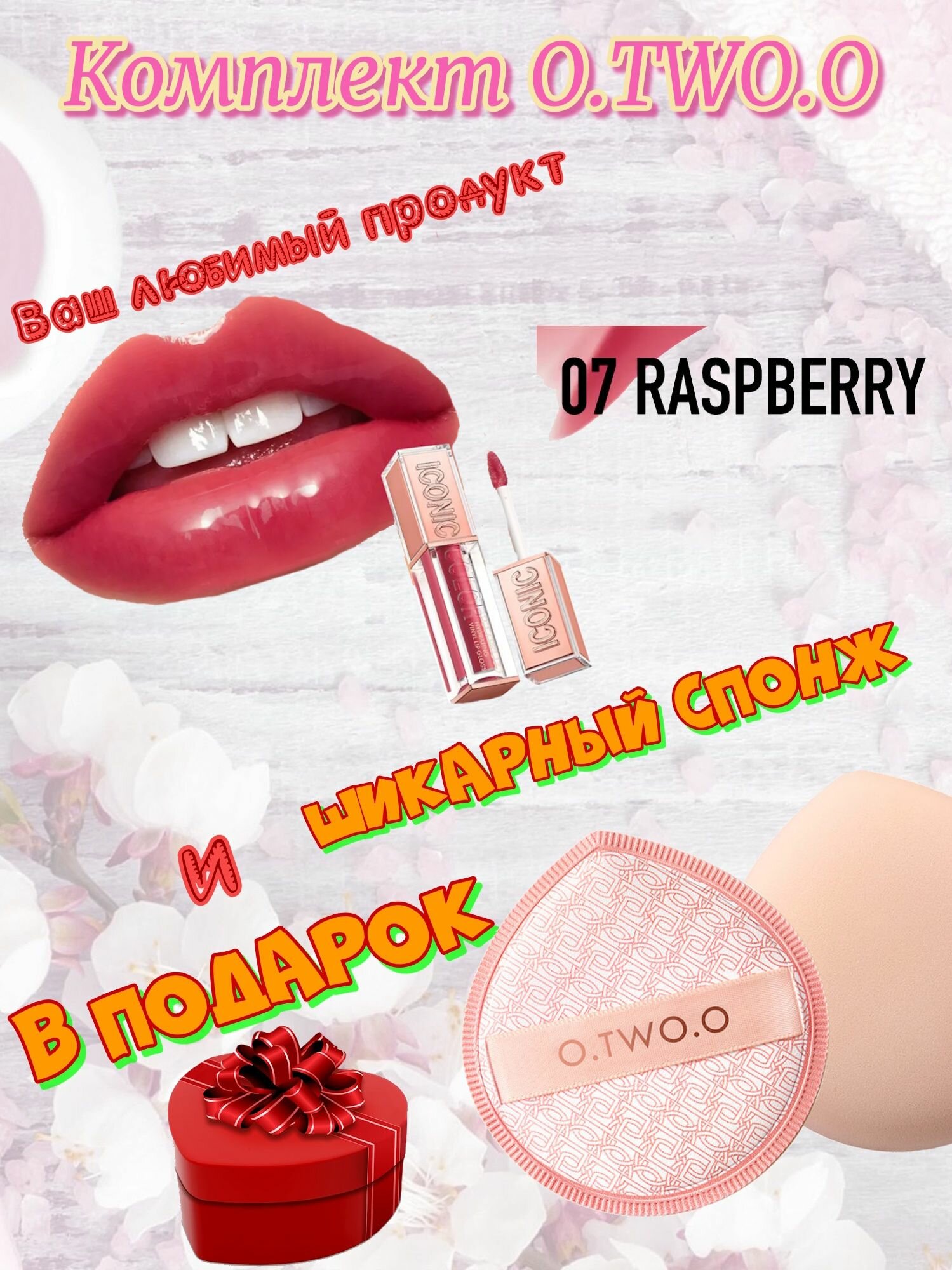 Набор O.TWO.O: Увлажняющии блеск для губ "Виниловый Эффект", тон 08(Личи), 3.3гр + спонж в подарок.