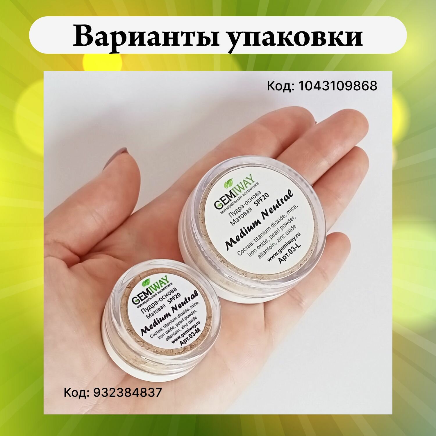 Ниже Вы можете прочитать отзывы на "Минеральная пудра-основа Medium Neutral SPF30" от бренда GEMIWAY, 10 мл/2 г, ознакомится с подробными характеристиками, посмотреть интересные обзоры и фотографии на "Минеральная пудра-основа Medium Neutral SPF30" от бренда GEMIWAY, 10 мл/2 г.