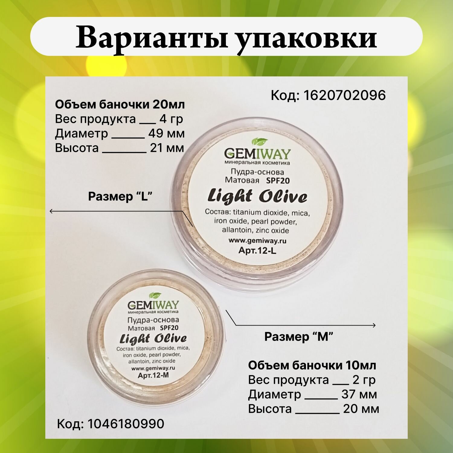 СохранитьПудра-основа матовая минеральная "Light Olive" GEMIWAY (SPF 20) 10мл / 2г . Рассыпчатая, натуральная пудра для лица интересное: