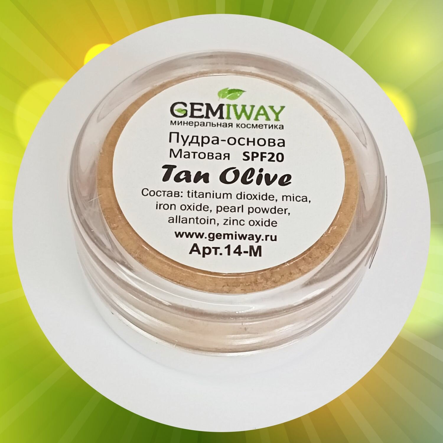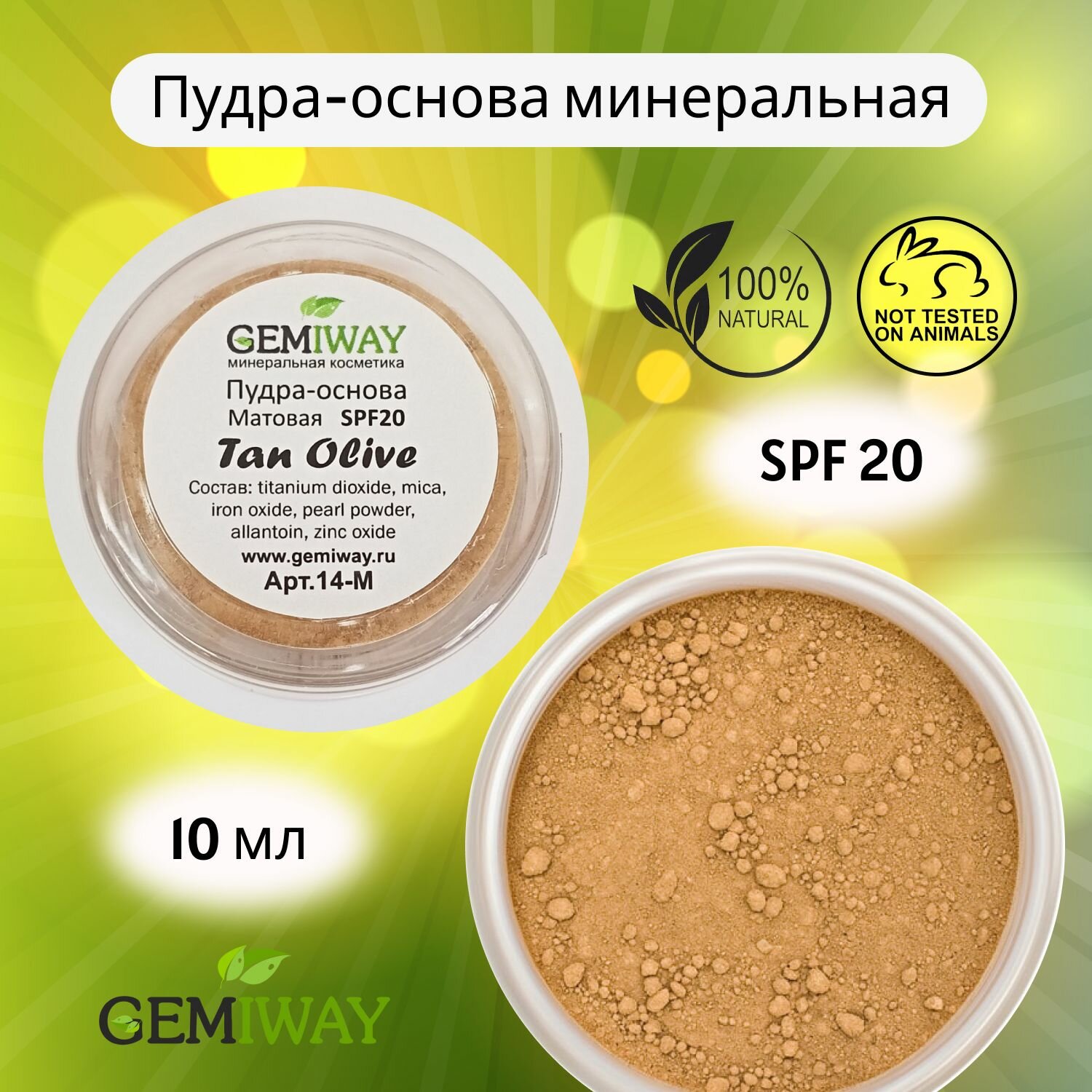 Купить Пудра-основа минеральная Матовая "Tan Olive" GEMIWAY 10мл / 2г ( SPF 20 ). Рассыпчатая, натуральная пудра для лица