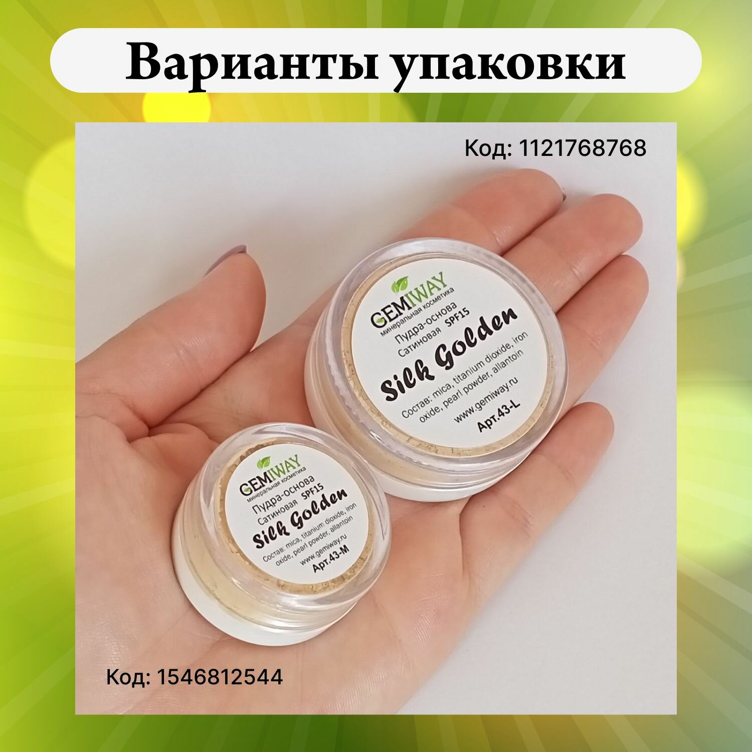 Пудра-основа минеральная Сатиновая "Silk Golden" SPF 15. GEMIWAY 10мл / 2 г . 100% натуральная, рассыпчатая пудра