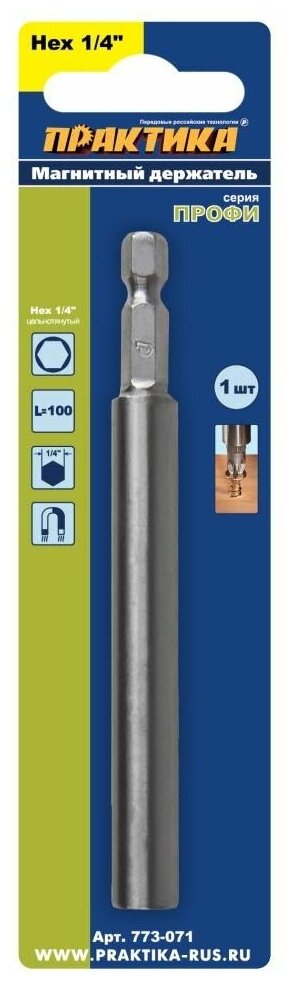 Переходник Удлинитель магнитный держатель 100мм для бит 1/4" цельнотянутый, (1шт) блистер ПРАКТИКА 773-071
