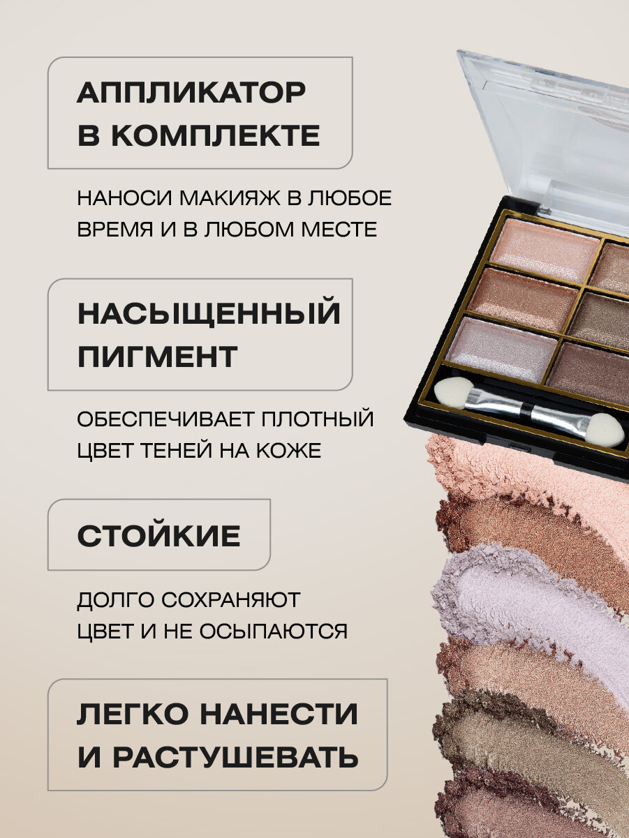 Палетка теней для век Farres компактные 6 цветов перламутровые, тон 04 интересное: