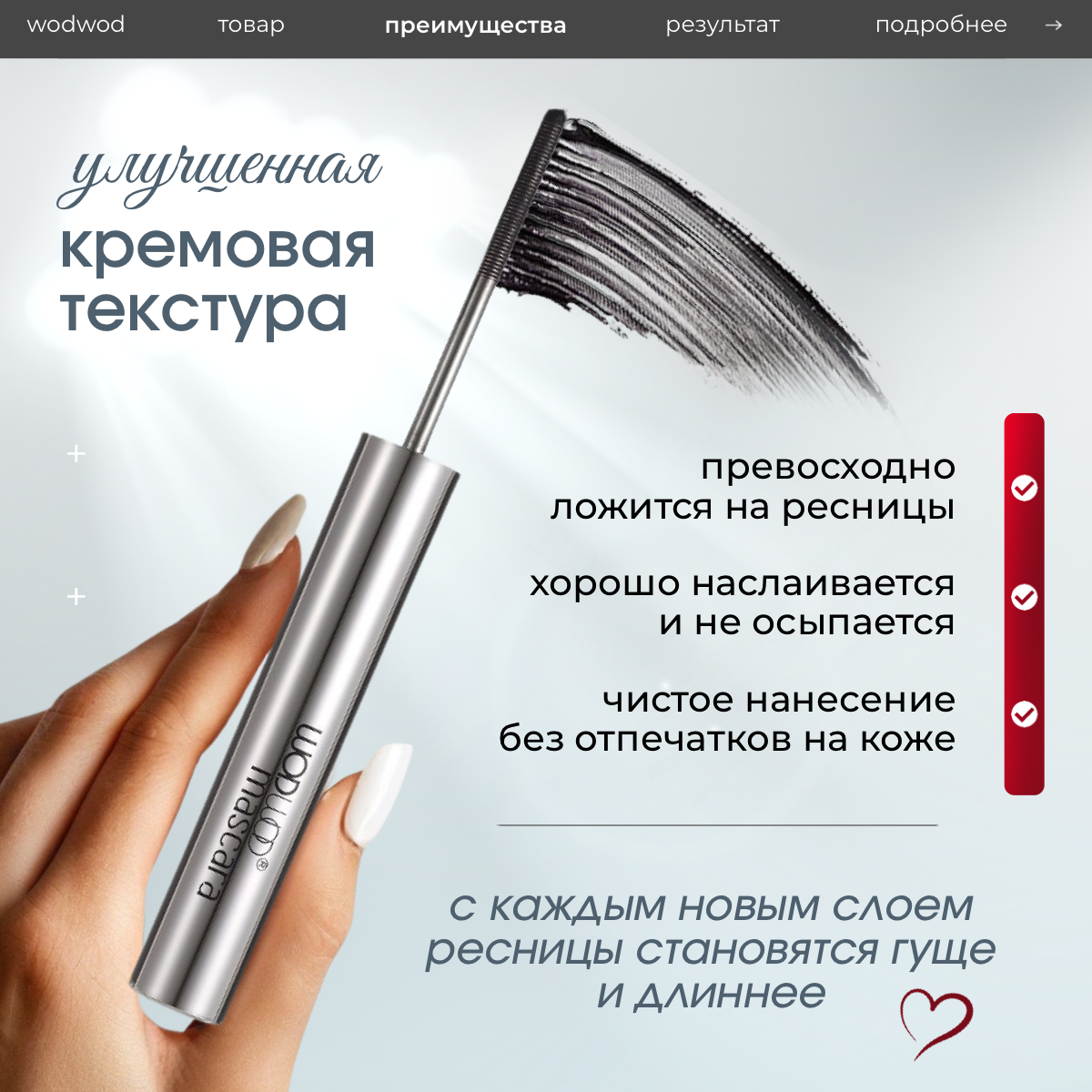 Ниже Вы можете прочитать отзывы на Тушь для ресниц чёрная с металлической щёточкой WODWOD mascara, суперобъём и длина, ознакомится с подробными характеристиками, посмотреть интересные обзоры и фотографии на Тушь для ресниц чёрная с металлической щёточкой WODWOD mascara, суперобъём и длина.