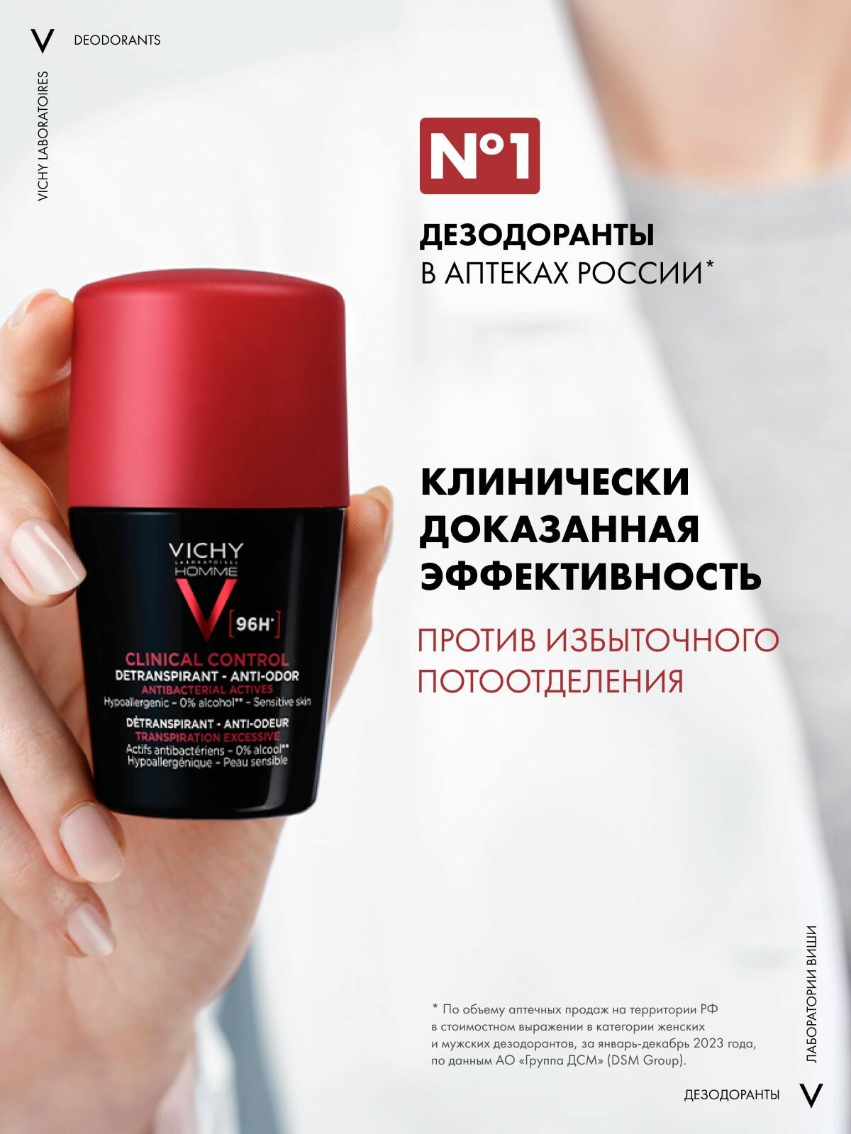 Купить Vichy Homme Clinical Control Мужской дезодорант-антиперспирант от пота, 96 часов защиты, с цинком и перлитом, 50 мл