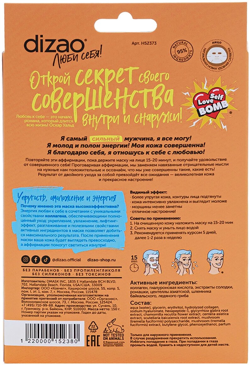 Маска для лица Для самого сильного, 100% коллаген, 5 шт, Dizao интересное:
