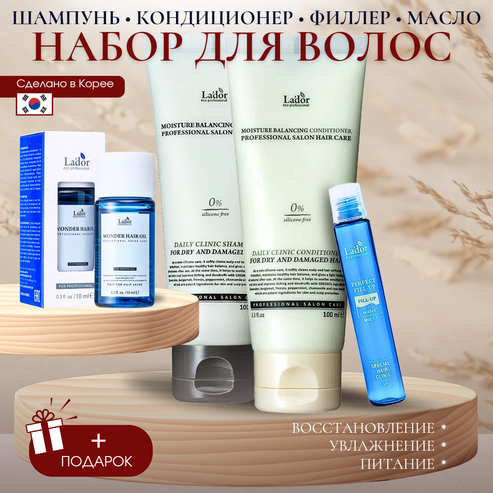 Купить Набор для ухода за волосами Lador шампунь 100мл, кондиционер 100мл, масло 10 мл, филлер 13мл+ Подарок